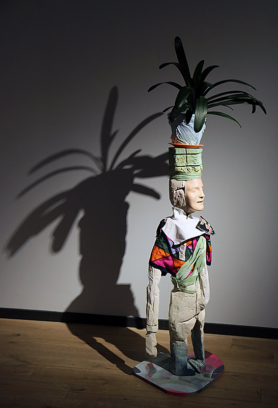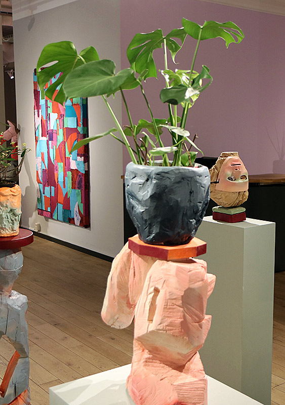 I flera av verken ingår en krukväxt som integrerad del. Det faller sig helt naturligt i den här kontexten att ge verken extra liv på det sättet.