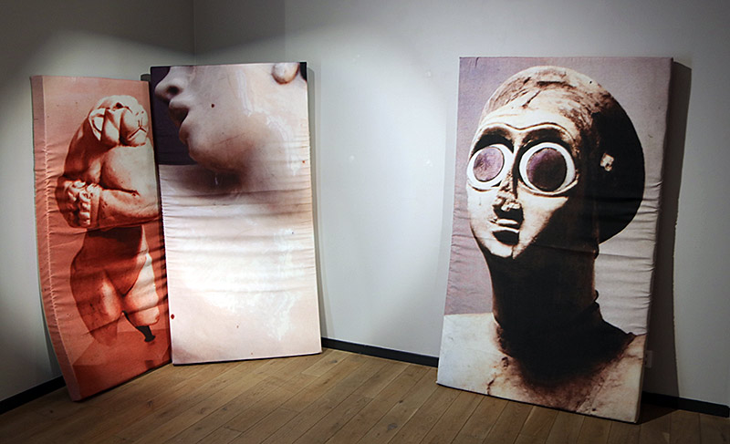 I ett hörn står några madrasser med klassiska skulpturer som motiv på varen. Form och innehåll drar åt olika håll. Tankarna fylls av många överraskade varför. Men tar man med sig förutsättningslärans portalsats, den att om någon gör en utsaga vill hen också säga någonting får jag problem med de här verken. Mig säger de inget i sig, men de är effektfull rekvisita i konsthallen.