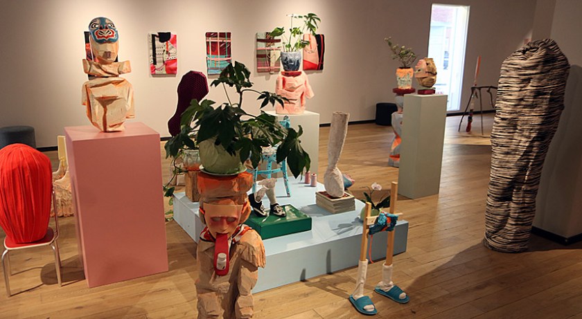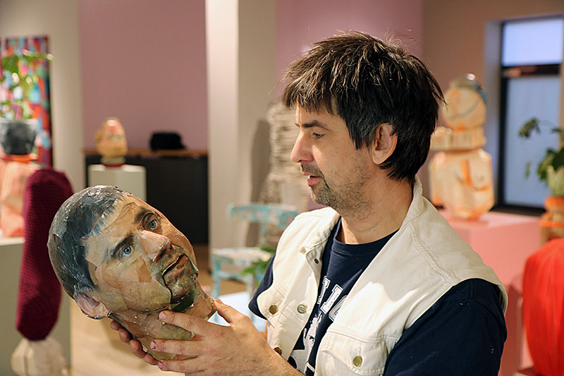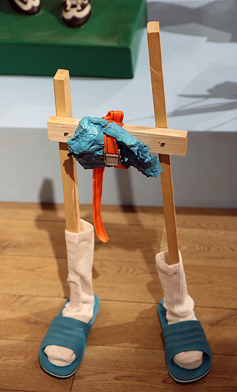 Konsthallen är fullbrötad av hans verk. På väggarna hänger textilcollage. De tycks inte främst skapade för att söka traditionella estetiska effekter. Tyglapparna, ibland stora delar av klädesplagg, sägs av konstnären bära metaforiska meddelanden. Och visst kan de vara så att delar av en bomberjacka ger associationer till skinheads och våld. Om man ser det så adderas en betydelsekomponent. De annorlunda mönster collagebitarna skapar är med att bygga upp en annan. Han monterar collagen på grova ramar så de också får en volym. Och utstickande föremål ger reliefverkan och jag hör honom kalla de här textilcollagen skulpturer. Liksom all den andra konst som visas här verkar annorlundaskapet vara ett övergripande mål.