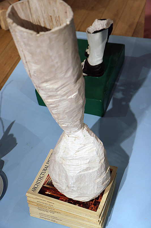Skulpturerna i utställningen ser ut litet hur som helst. Ibland bär de en enklare symbolik. En slöjdad urna står med en bunt exklusiva gamla arkitekturtidskrifter som podium. Deras estetik får tjäna som hans språngbräda och antites.