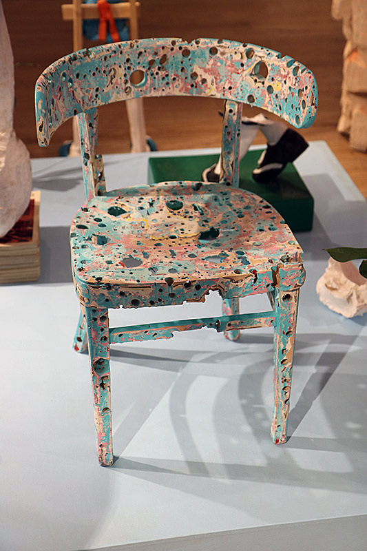 Ett av verken är en nerkladdad stol som borrats en massa hål i i olika dimensioner i. Inte mycket att sitta på längre. Är tanken att när ett nyttoföremål berövas sin funktion kan det användas som konst!?
