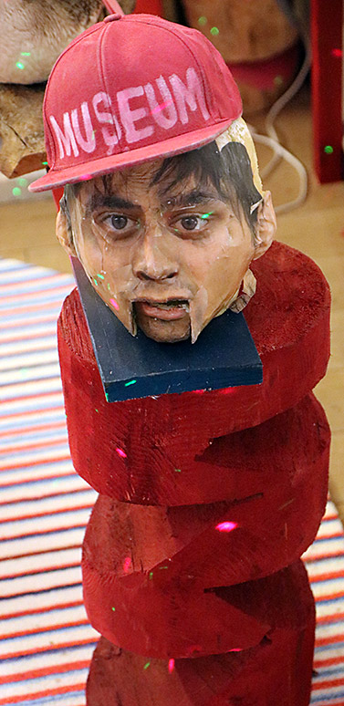 En randig trasmatta är monterad som en stod. Om han med ett sådant verk hyllar eller dissar ett traditionellt textilhantverk är svårt att förstå. Men en gest är det i alla händelser.