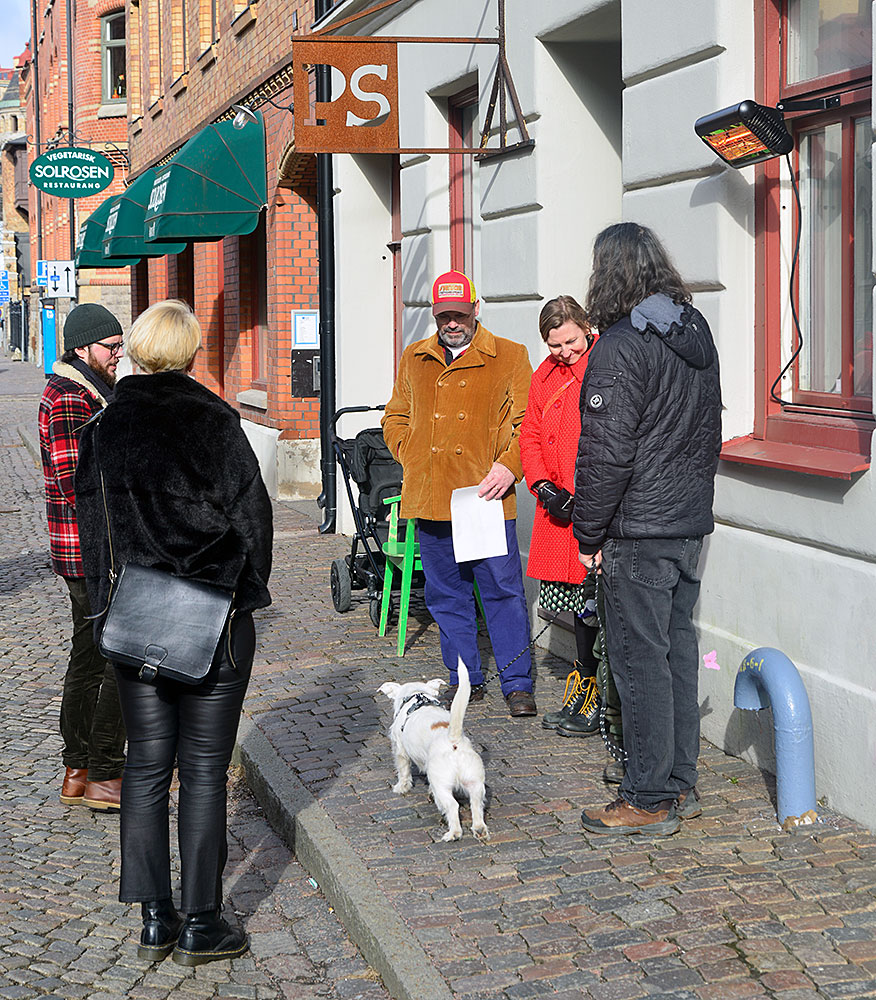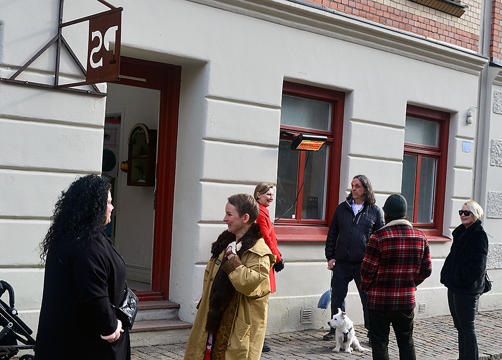 Även här var det så att en stor del av det pandemistyrda sociala livet skedde utanför på trottoaren. Inklusive blomster till utställaren.