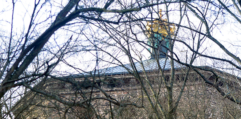 På vägen upp och mot Kastellgatan så var solen på väg ner och fick det att glimma bakom grenverket; kronan på Skansen Kronan.