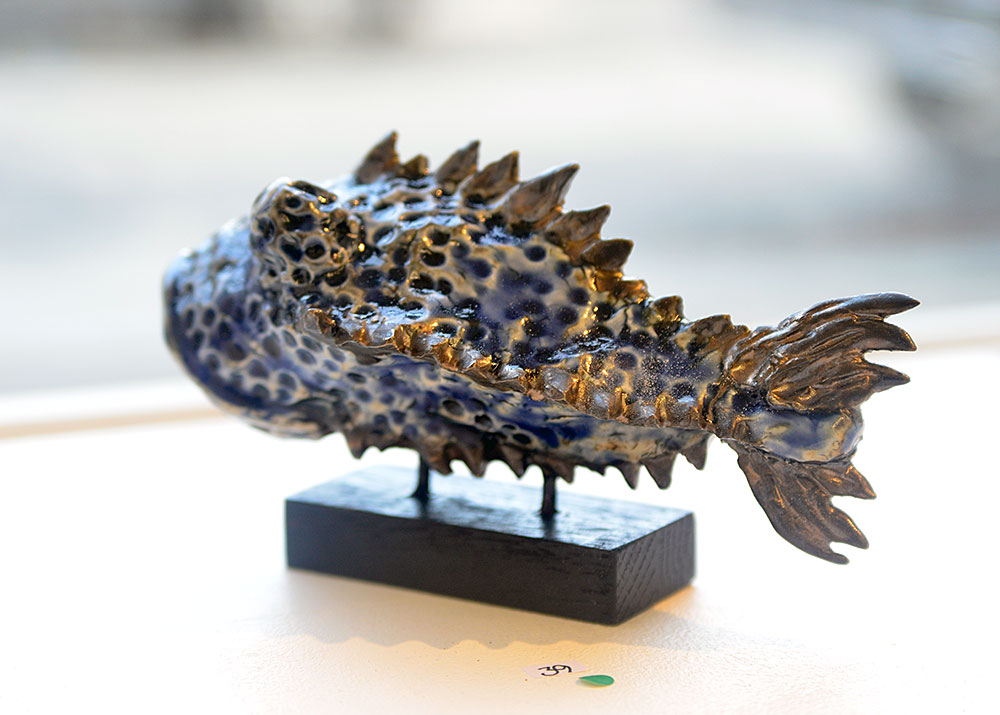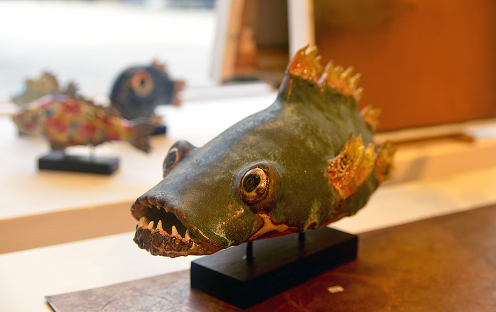 Thomas Willard visar målningar och Gunnar Larsson keramisk skulptur.