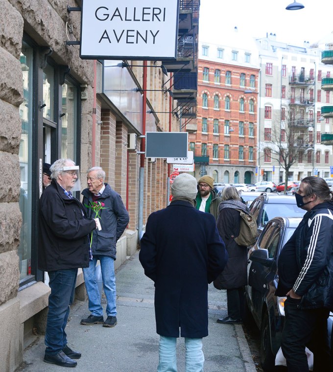 Numera är det en lounge utanför på trottoaren/gatan med utställare, gallerist och besökare på väg in och ut. Se på bilderna att det är väl förberett. Över ett fönster!
