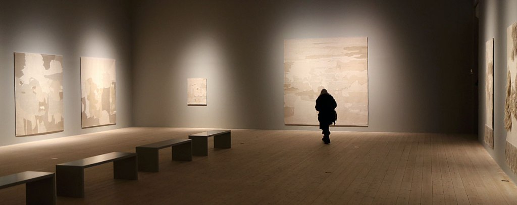 I Akvarellmuseets stora sal visas ett stort antal vävda verk av Andreas Eriksson. Jag har aldrig sett en liknande utställning. Rummet är dunkelt med direktbelysning på verken. De här verken har en säregen färgskala inte minst i det här milda ljuset. Uttrycken är lågmälda, men man lyssnar mera intensivt till viskningar än till rop. Och man fångas av de här verkens lugna karisma och dras in i deras kraftfält.