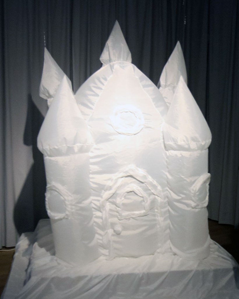 Utställningen innehåller verk i många tekniker. I en avdelning står ett uppblåst luftslott i vitt tyg. Man hör hur fläkten som håller det uppumpat flämtar och pyser. Vid minsta störning kommer luftskottet att sjunka ihop när all den tomhet som höll det uppe är borta. En bild av vår tid? Tja, men vad säger den egentligen? Blir man upprörd av den? Eller stridslysten? Nej inte precis. Åtminstone inte jag. Men kul med en uppblåsbar skulptur som väcker tankar på våra livspredikament.