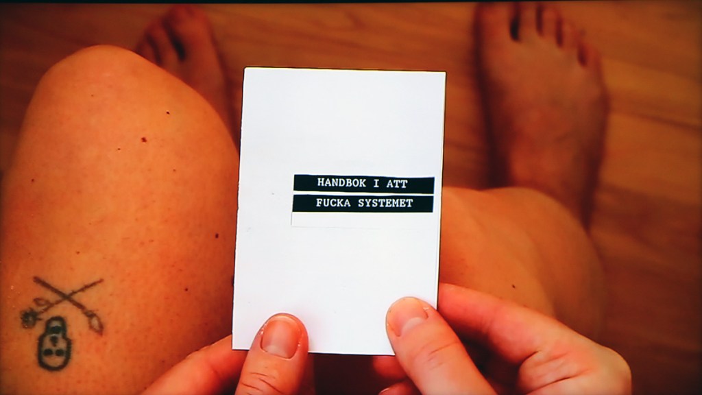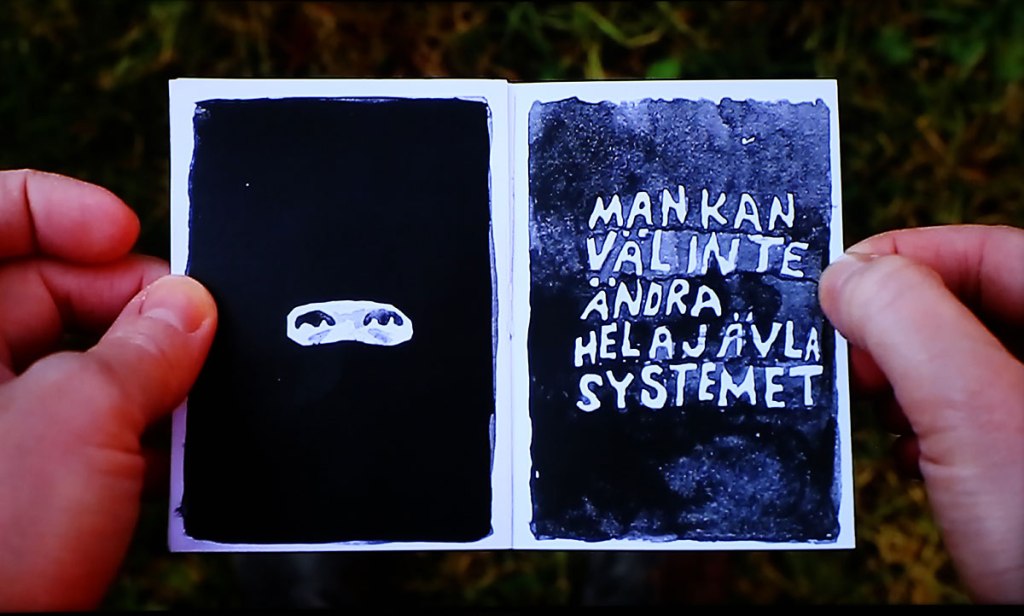 Hon jobbar också med pamfletter. Varje år sedan 2009 ger hon ut en sådan om året med titlar som ”Handbok i att fucka systemet” och ”Mitt hjärta är en bomb”. Litet punkestetik light finns det i några av dem. Här på utställningen får vi 2021 års pamflett som heter Vaccin. Den innehåller småkul teckningar och en avslutande vers. Tidigare års pamfletter kan ses i ett bildspel på storbildsskärm. I några av dem är antietablissemangsilskan mera direkt slagkraftig. Och här finns några stridslystna formuleringar.