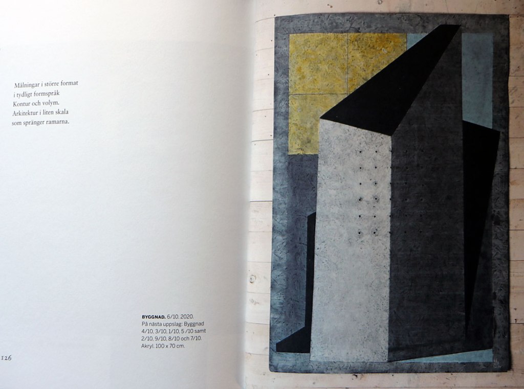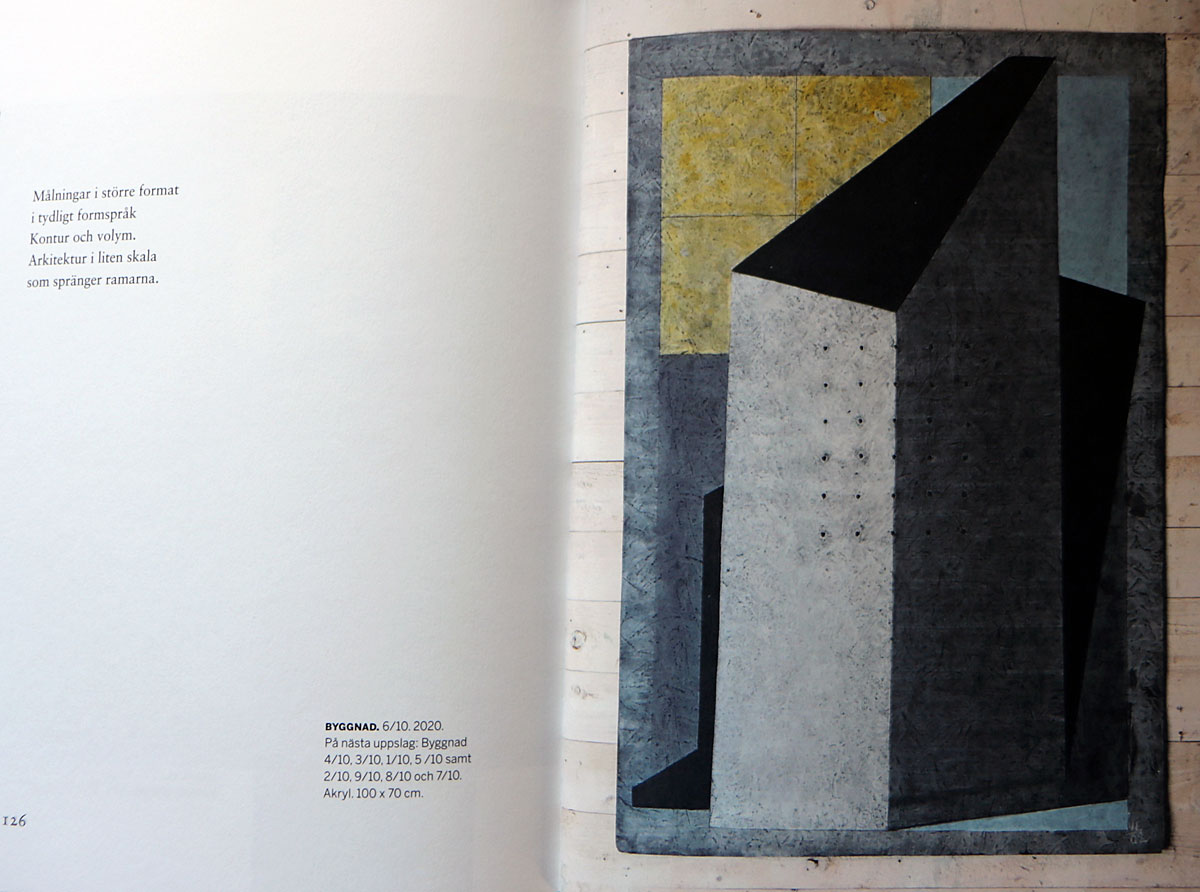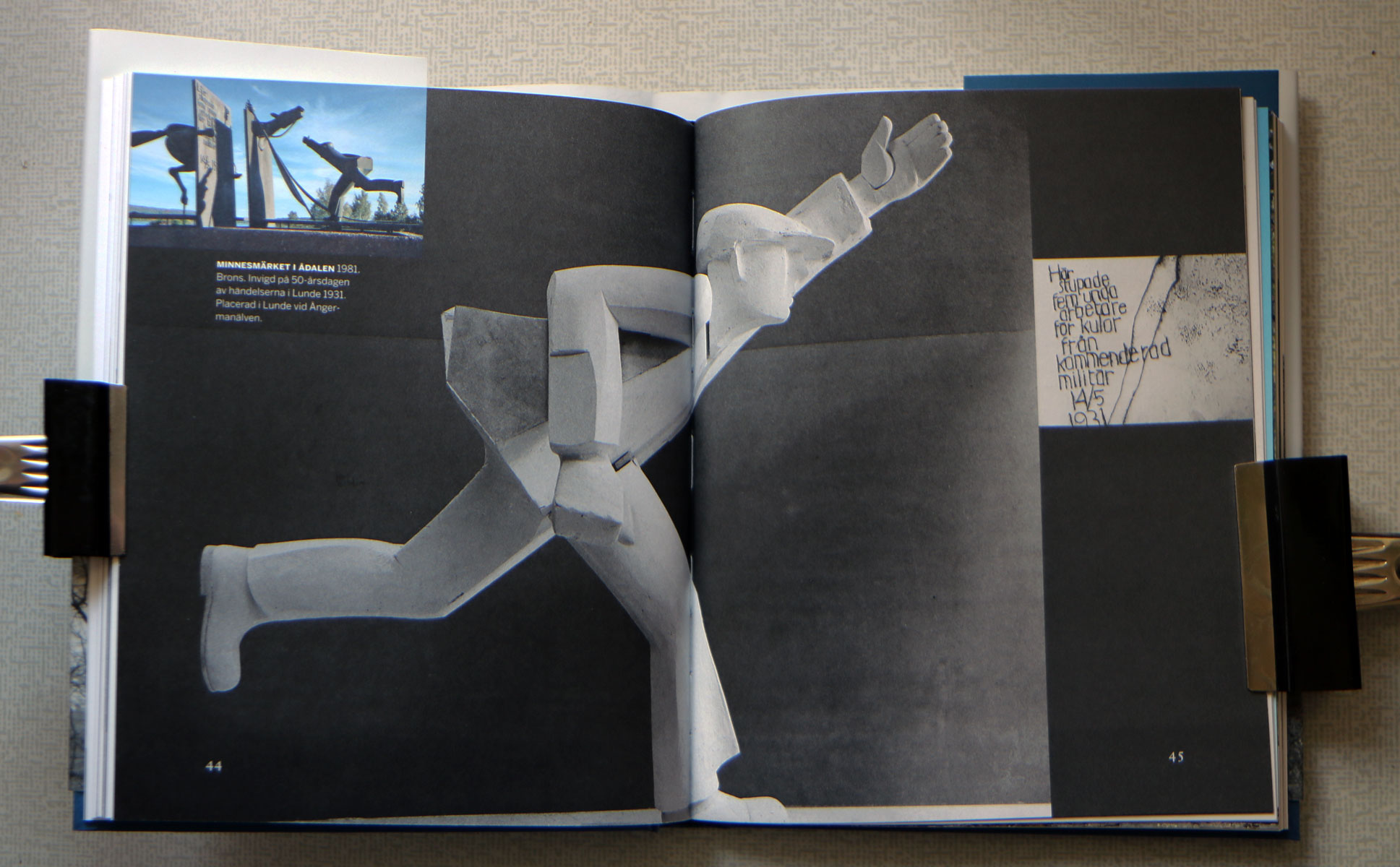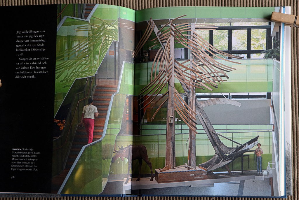 Det finns ett uppslag med en bild av hans storstilade verk i Södertälje Skogen. Ett märkligt verk, helt fascinerande där det sträcker sig över två våningar. Efter att varit magasinerat i sjutton år får vi veta att det nu har återuppstått i Stadshuset i Södertälje. En välkommen återkomst.