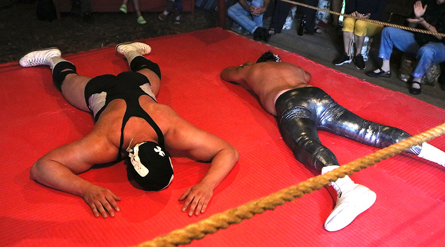 Efter en påa av Jonas Liveröd, som också var domare i den kommande matchen, kom så kvällens luchadores, alltså våra wrestlingkombattanter. De kom ur Göteborg Wrestling och heter en sån här kväll när de kör mexikansk wrestling Rudo del Mal & Plata Machina Pequeña, de heter Steinbolt och El Vecino när de kör vanlig wrestling (det gjorde de inte här). El Rudo var den store onde och Plata var den lille gode, för det ska alltid finnas en av varje.
