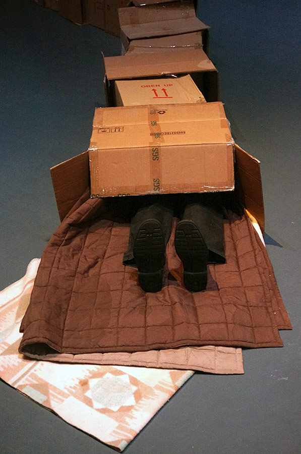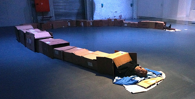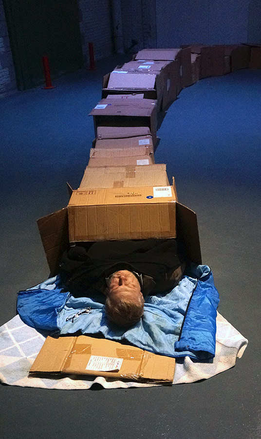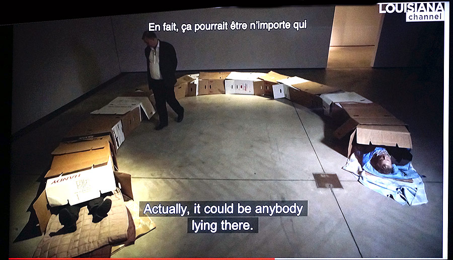 Ett verk intresserar mig mer än de andra här. Det är dansken Peter Land som gjort ett stort verk som heter Back to Square One. Det är en uteliggare som sover i kartonger. Mannen är en minutiös porträttavbildning av konstnären själv. Och det är hans tanke. Det kan bli vem som helst av oss som hamnar där. Verket är realistiskt i alla delar. Men helheten med de många kartongerna i en båge bryter realismen och skapar en symbolisk framställning. Det handlar om en existentiell utsatthet vi alla kan första och själva känna.