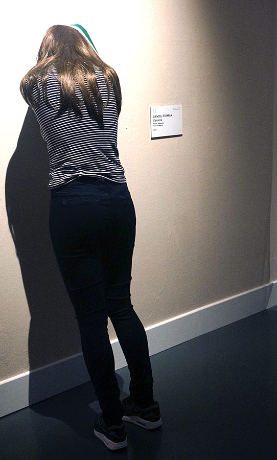 Redan vid entrén till den här utställningen slås tonen an. En flicka står med huvudet mot väggen. När man köpt biljetten och pratat litet med personalen står hon kvar i exakt samma sorgesamma ställning. Det visar sig vara utställningens första hyperrealistiska skulptur som direkt skapar en överväldigade illusion som om konst och liv vore synonyma. Den är gjord av Daniel Firman.