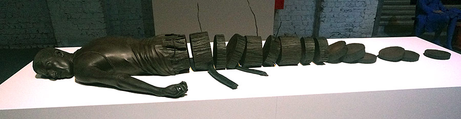 På ett stort vitt podium ligger Fabien Mérelles bronsskulptur. Fullkomligt naturligt ligger en människa på rygg. Men hans kropp från naveln och neråt är skivad. Också det fullkomligt naturalistiskt. Men what about it?!?