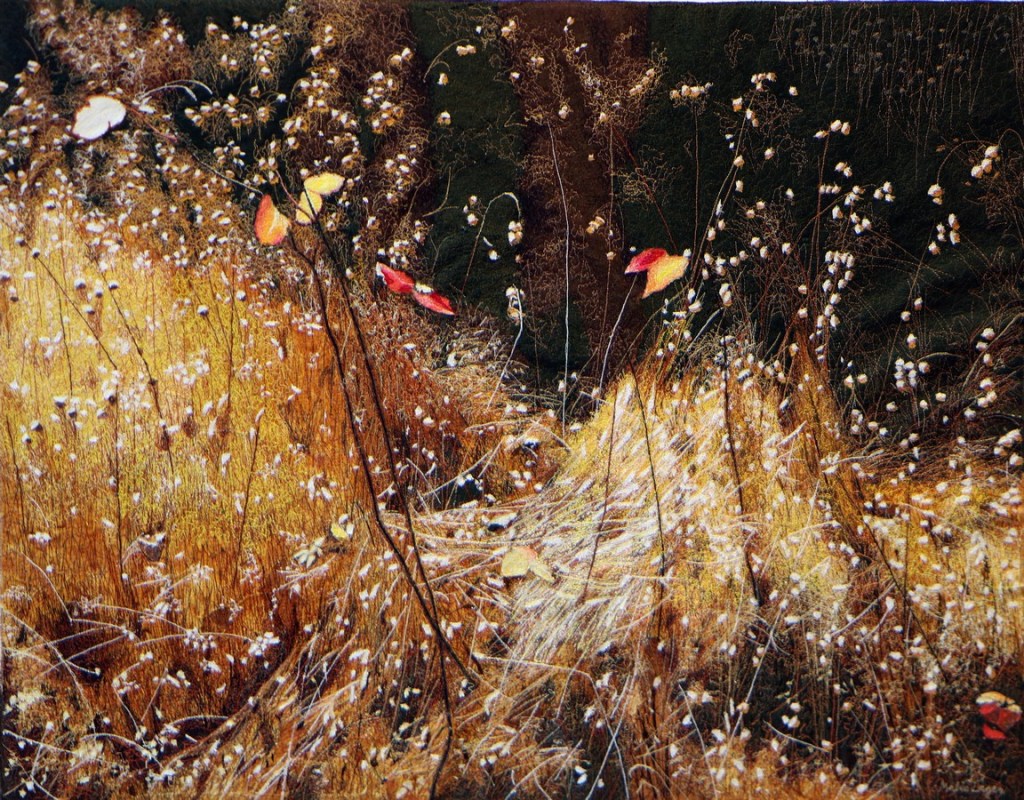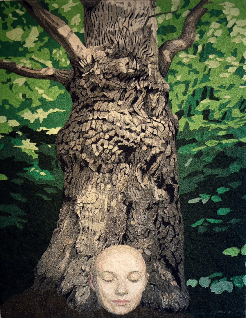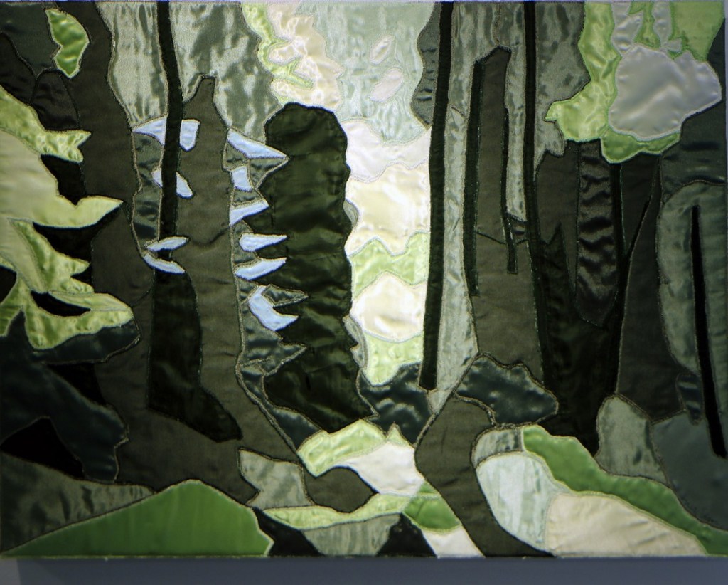 På utställningen visas också en annan typ av verk. Ett träd med ett ansikte känns stiliserat och stelt på ett sätt som jag inte tycker klär hennes uttryck. Jag ser den bilden som en övergång till de mer abstrakta bilder hon visar. Det är textilcollage med välvalda tyger i färg och glans. Även här får hon ett ljusspel i bilderna som är lockande för ögat och fascinerande i uttrycket. Men i de här bilderna slätas hennes originalitet ut.