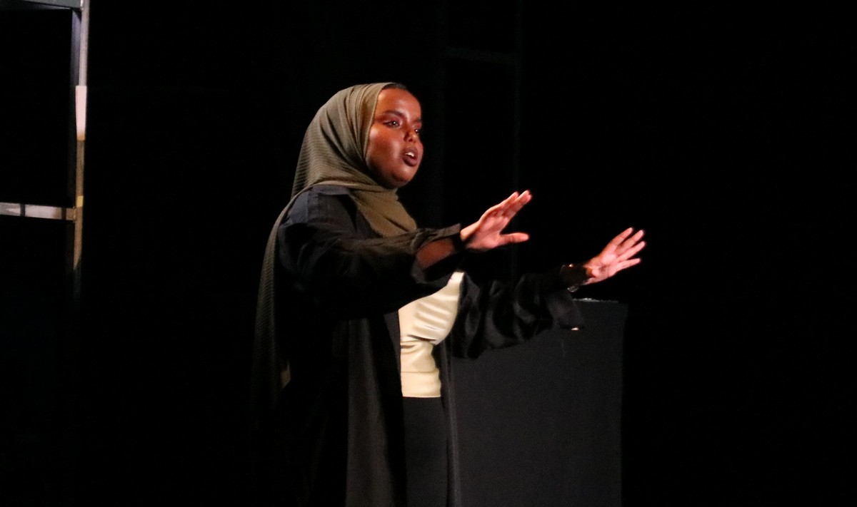 I spoken word ska orden ha huvudrollen. Dom estradpoeter jag mött har pratat på utan rekvisita, men med mycket attityd och nyanser i orden. Och Farhiya Feysal har järnkoll på sitt språk. Hon liksom mejslar fram sina bilder och sitt budskap. Upprepar när det behövs. Både för innehållet men också för Faisal språkrytmen. Det svänger om hennes berättande. Och fast hennes berättelsecollage är långt finns här inga longörer.