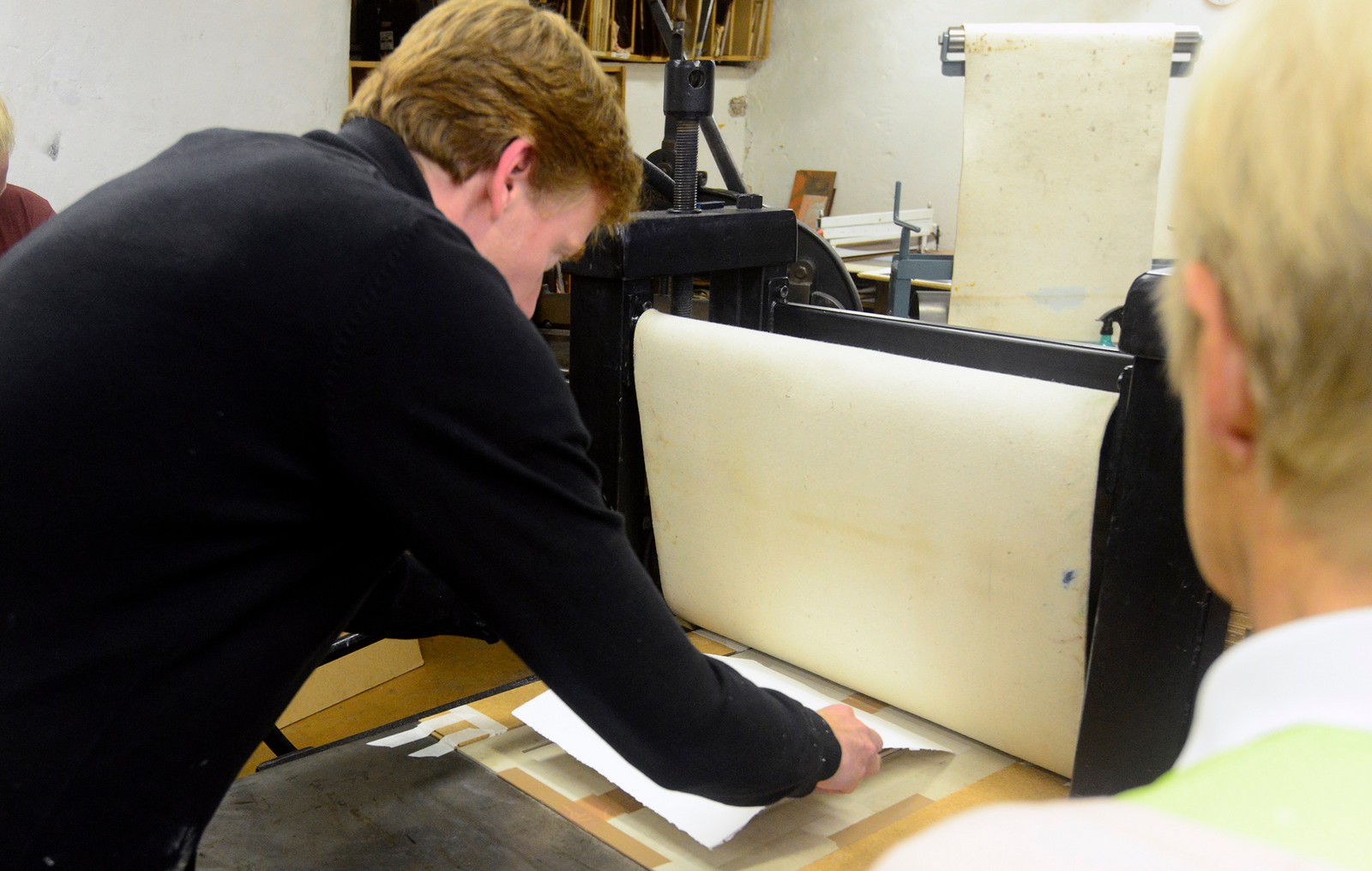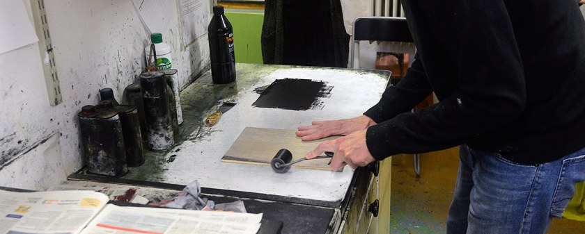 Han trycker oftast flera gånger på samma blad med olika stockar och infärgningar.