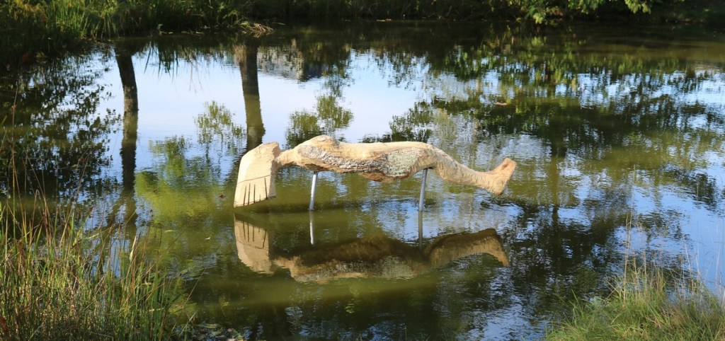 Det kunde inte ha börjat bättre. Det första jag såg när jag kom till Rum 44as domäner den 26 september var en ovanligt vacker skulptur som speglade sig i dammens vatten som tacksamt reflekterade den. Kultur och natur hade fåtts att samarbeta och smälta samman. Det var en stiliserad gestalt, en skulptur av bästa modernistiska märke. Den vackra formen var rätt på ett så självklart sätt. Det är en träskulptur motorsågad av Anette Sjölander. Jag har sett flera bra skulpturer av henne genom åren. Dock tyvärr ingen i en offentlig miljö. En skulptur som den här ger karaktär, ro och skönhet åt sin plats. Ögat stannar vid den och tankarna återkommer till den.