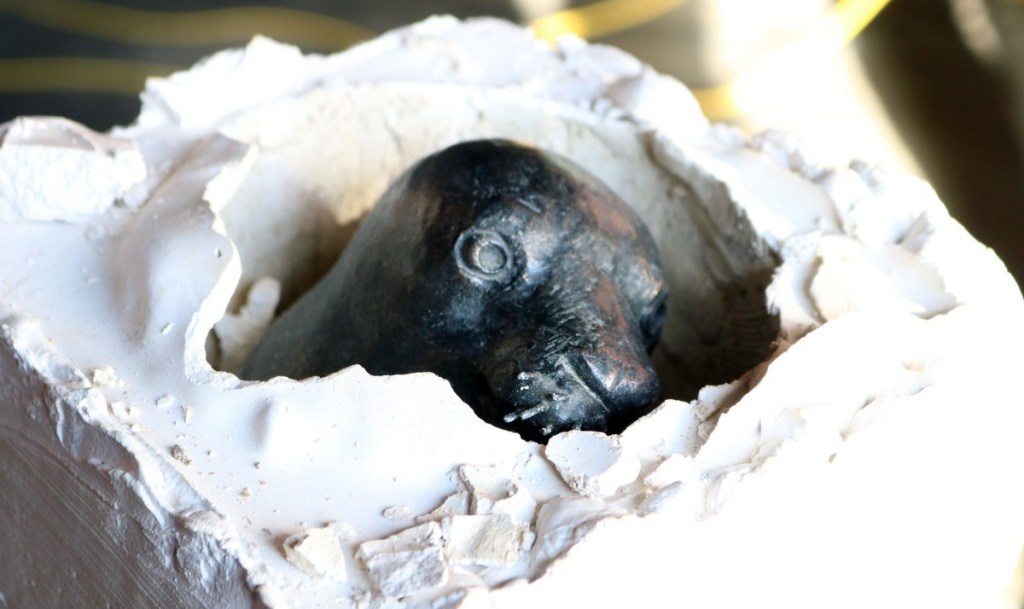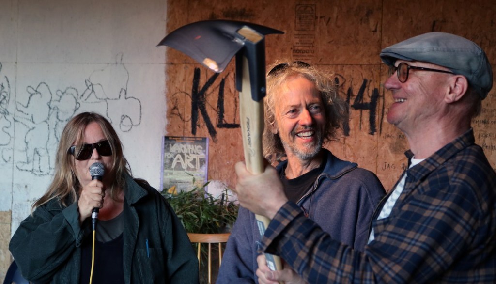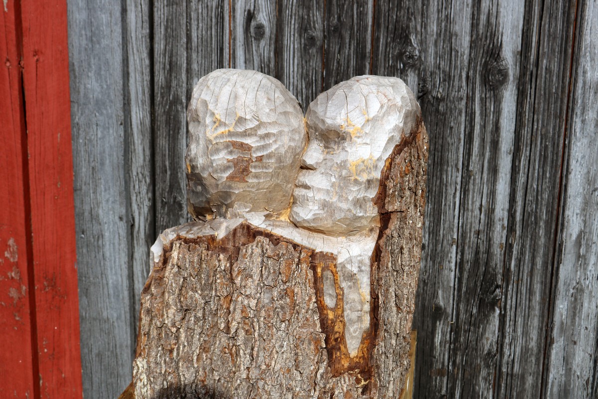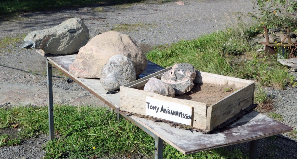 Här hade varit en skulptur/installationsworkshop. Tony Abrahamsson hade hittat några stenar i det sjölanderska kulturlandskapet. Ur en hade han huggit och slipar fram ett lipande djurhuvud som gjorde intryck. Jag ser att Martin Hansson också deltagit i workshopen. Jag vet inte om han jobbat på plats med den skulptur han överlämnade som en gåva till Rum44. Den hade fått sin motividé från kollegan Björn Therkelsons ord: ”Rum44 är en vak i den kulturpolitiska isen, där konstnärssälarna kan sticka upp nosen”. Sånt översätter ett proffs som Martin Hansson till bästa skulpturska.