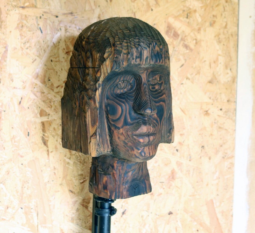Åter på Rum 44as gård hittade jag två av dagens bästa upplevelser. Dels ett rum med målningar och skulpturer av Anette Sjölander. Det var dels huvuden i ådrat trä. De fick historiens pendel att svänga fram och åter. Dels också ett starkt expressivt måleri där bl. a ett självporträtt gav sig till känna i målarglädjen.