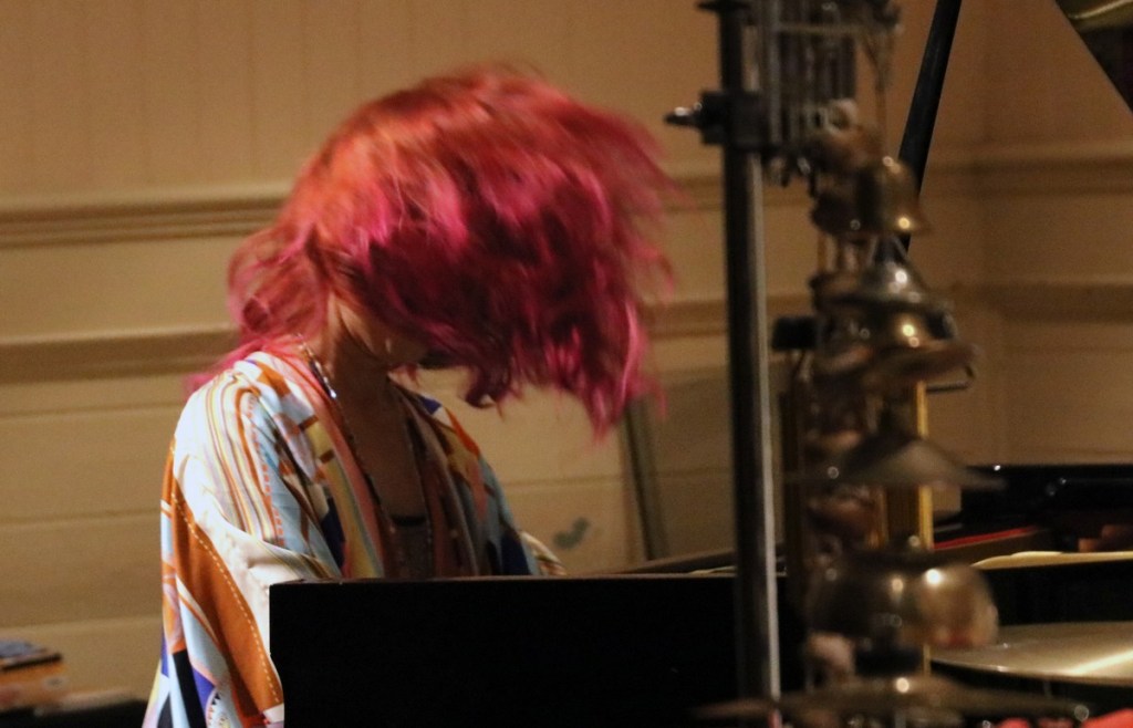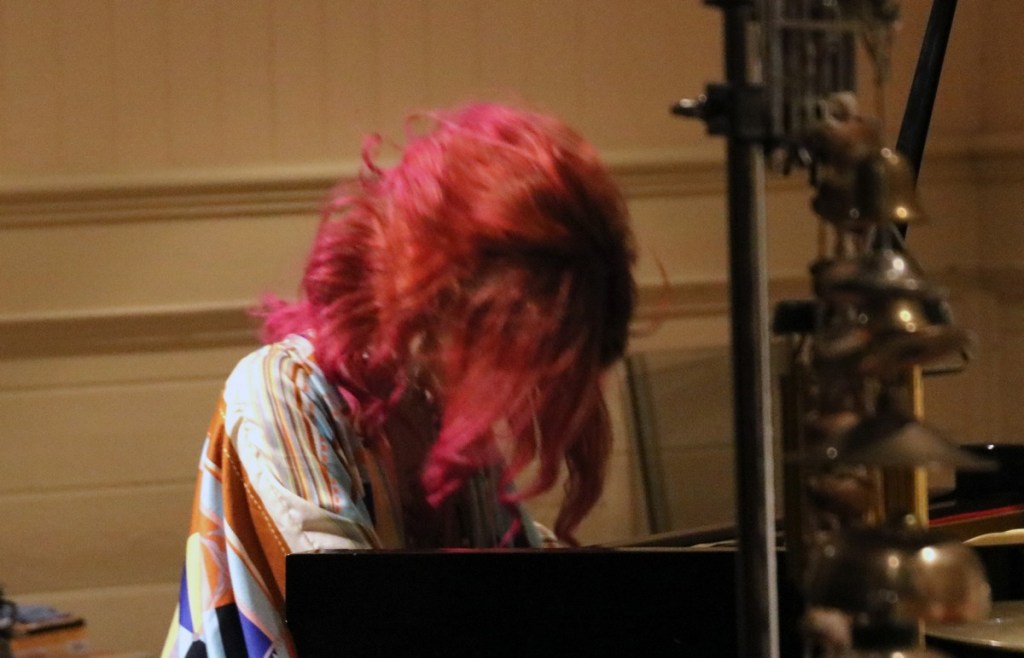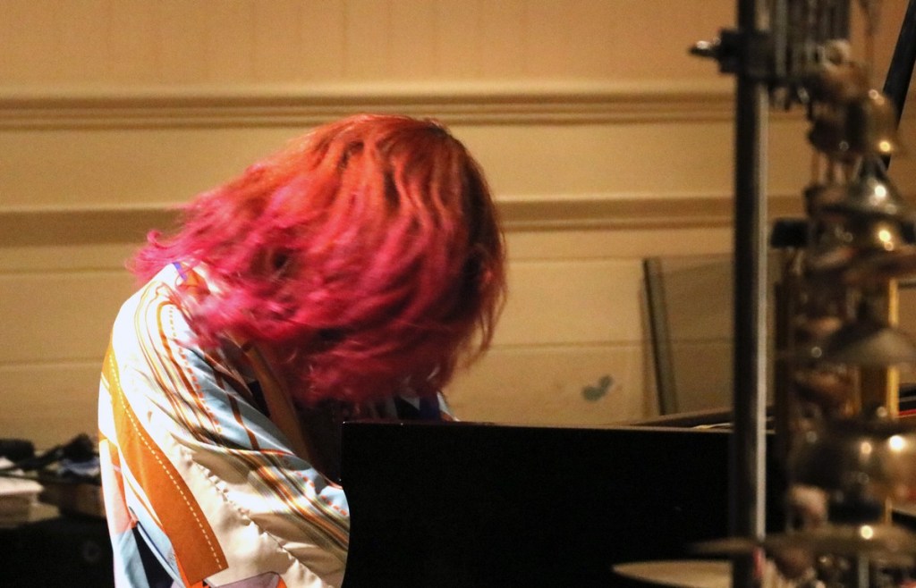 Improvisation kan ses som ett sätt att söka det unika, i musiken det ohörda. Jag läste, utan att veta om det kan stämma, att det finns 429 981 696 unika kombinationer i kromatiska skalan och 16 777 216 i dur-skalan? Som jag tolkar det finns det outtömliga möjligheter till musikaliska innovationer. Det blev också en upplevelse som tog andan ur en när Naoko Sakata tog oss med på sin musikaliska upptäcktsfärd. Det blev ett spel som spände mellan ytterligheter, från skirt och lugnt till starkt bullrande rumbel. Hon satt så att man inte såg hennes ansikte när hon spelade, hennes röda hår skymde hela tiden. Man fick koncentrera sig helt på musiken. Den krävde sin tribut och fick en att fascinerad glömma allt annat.