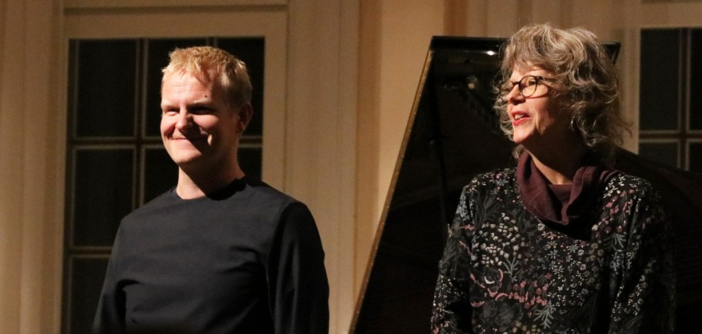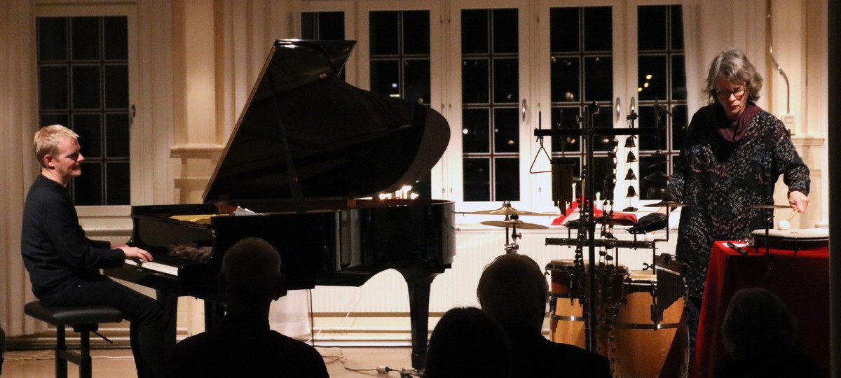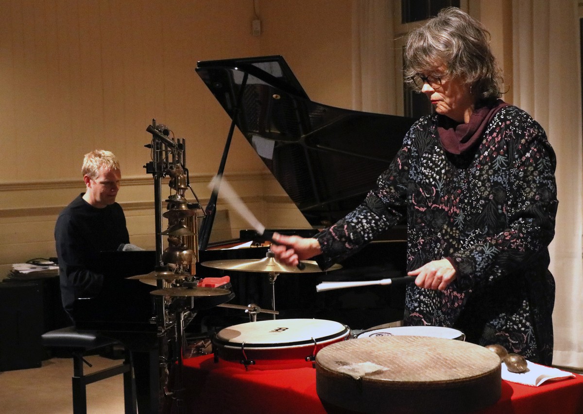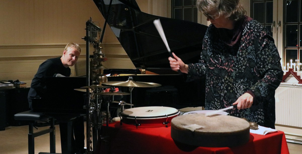 Joona Toivanen spelade på ett preparerat piano, där han manipulerade strängarna med vad som såg ut som klämmor och tyg. Ebba Westerberg spelade på en ställning där det hängde klockor, pinnar och bjällror. Hans pianospel var mera konventionellt, stramt och återhållet, men klangerna blev annorlunda. De spelade färdiga låtar och improviserade. Jag kunde inte skilja de skrivna och de improviserade åt. Kanske är det så att de kompositionerna är improvisationer som blev särskilt lyckade och som därför upprepas. Ebba Westerberg spelade inte på sina slaginstrument som en trummis, långt ifrån. Det handlade inte om rytm eller takt. Hon spelade, dunkade inte takten. Så blev det två finlirare som möttes. Och de förde oss in i sina klangflöden. Pianot stod för en stadig grund, den axel som de olika klockorna, bjällrorna, pinnarna, cymbalerna och trumskinnen dekorerade kring. Deras spel och samspel förde mig till musikaliska platser där jag aldrig varit. Upplevelsen blev nyfiken upptäckarglädje.