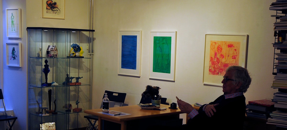 I samma kvarter även det med Nr 7 ligger Galleri Uddenberg. Galleristen hade äntligen efter några intensiva dagar, hängning-förhandsvisning-vernissage, fått en stund över strax före stängningsdags, så han kunde se hur uttagningarna gick i Paris inför stundade Prix d’Amérique.