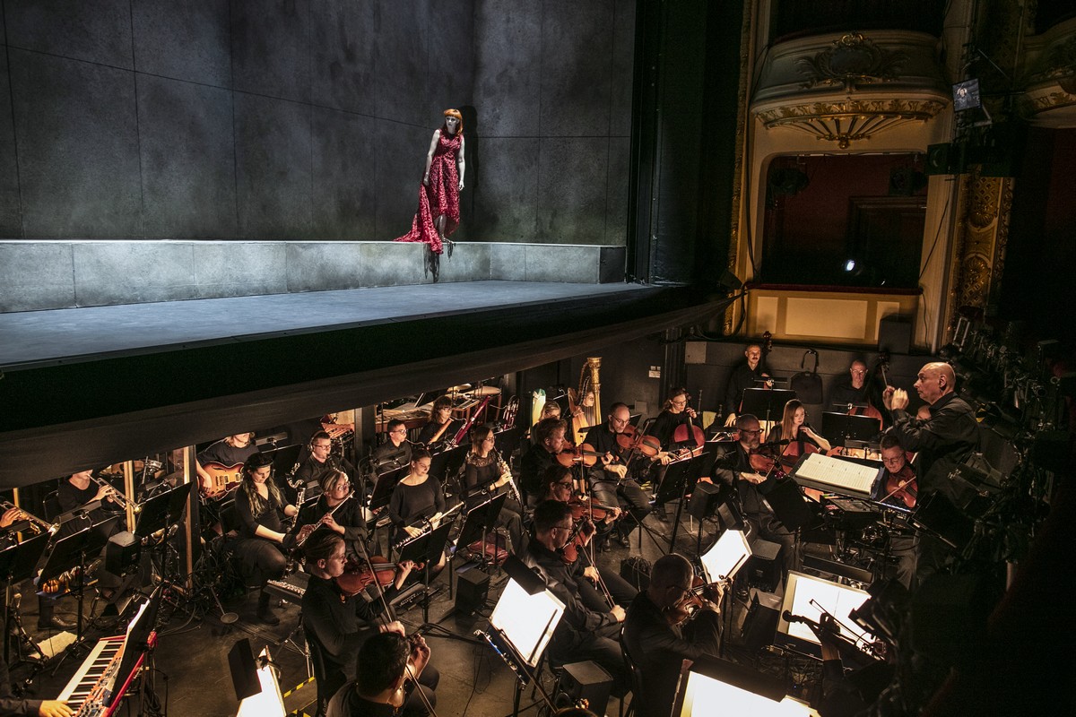 Den här föreställningen kallas industrirockopera i reklamen. Musiken är ett collage av musik av många vårtida och äldre. Det är mer eller mindre experimentell depprock ibland med gothdrag från 80 och nittiotalen av t ex Nick Cave, Iggy pop, Eninstürzende Neubauten och Joy Division. Joy Divisions major epos Love Will Tear us Apart fungerar perfekt här och framförs två gånger i olika sammanhang. Den handlar om en relation där kärleken prövas och är dömd. Postpunken blandas med klassiker som Gluck, Offenbach och Monteverdi. Den här musikblandningen fungerade perfekt i mina öron och gjorde i de här tolkningarna den här föreställningen till en musikalisk upplevelse utöver det vanliga. Musikaliskt med sina vitala stilmöten är den här operan en klassiker. Det var stundtals ett ruskigt tryck i den rockförstärkta orkestern. Och sångarna blandade musikalvarianten av rock med mera operaskolad sång. Särskilt starkt var de många klangrika och många gånger suveräna stämsångpartierna.