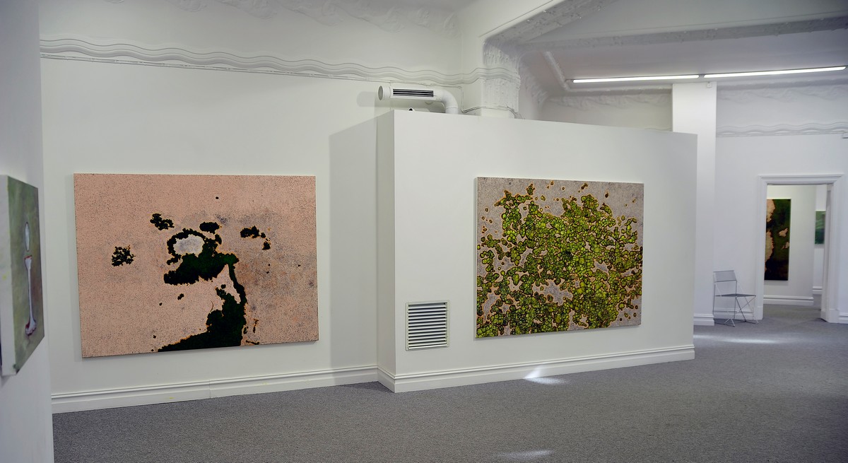 Ivar Lövheim visade stora målningar som för mig känns som mikro eller makro. Sett i ett mikroskop eller högt över jordytan eller … Allt med mycket material och struktur. Ett konstnärligt grepp.