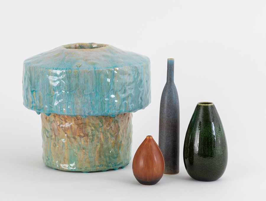 Ruhwalds arbeten är ur en serie med namnet Glasur Stykker han jobbat med sedan 2016. Stålhanes sirliga former är från runt mitten av förra århundradet. Båda har förstås tydliga tecken av sin tids estetik. I Ruhwalds fall menar Love Jönsson att formspråket och attityden är att hänföra till postmodernismen