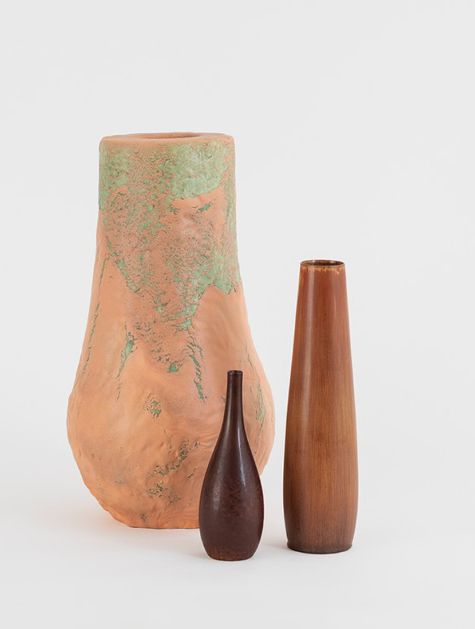 Ruhwalds arbeten är ur en serie med namnet Glasur Stykker han jobbat med sedan 2016. Stålhanes sirliga former är från runt mitten av förra århundradet. Båda har förstås tydliga tecken av sin tids estetik. I Ruhwalds fall menar Love Jönsson att formspråket och attityden är att hänföra till postmodernismen