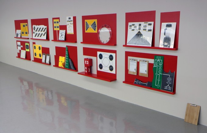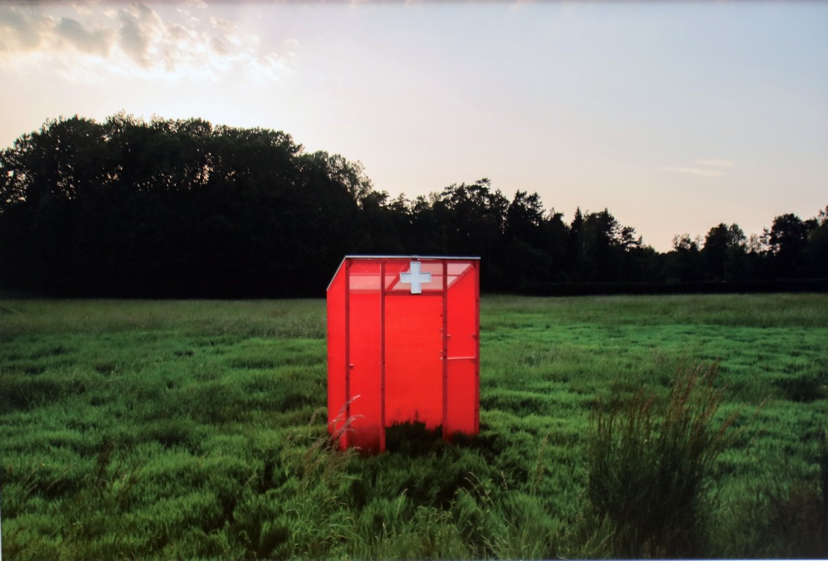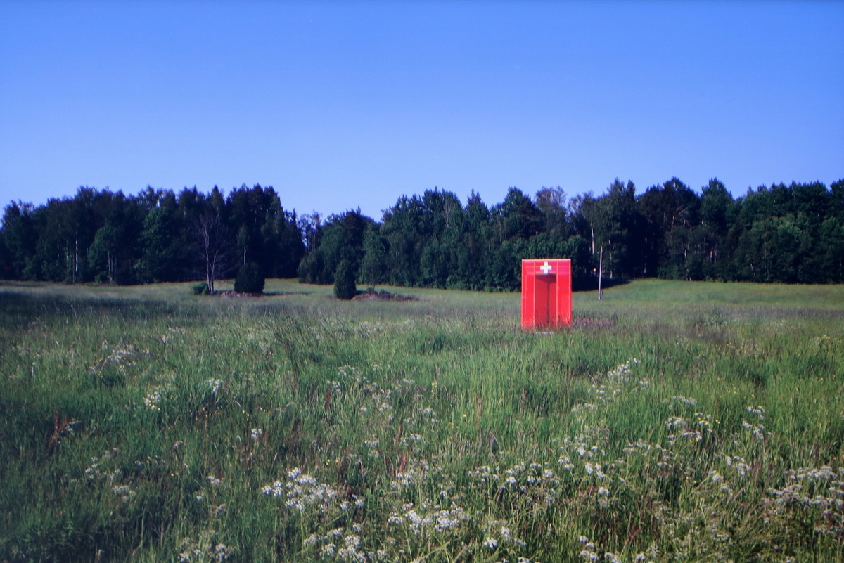 ”… i detta verk har jag börjat undersöka i vilken utsträckning fattigdom patalogiseras som ett hälsotillstånd i USA.”, skriver den utställande konstnären. Jag har svårt att de hur den undersökningen redovisas i den här utställningen. I Konstmuseets stora sal står ett rött tält med ett kors över. Går man in i tältet är det hyllor med burkar och flaskor som sägs innehålla alternativmedicin. Utanför står två vitmålade brevlådor. I den ena, får jag veta, kan man lägga sina egna recept på hemgjorda huskurer. I den andra kan man ta andras.  Längs den stora salens väggar är det inramade fotografier av det röda tältet utplacerat i olika miljöer som ett kalhygge eller längst ut på en brygga. En trappa upp finns planscher med organisationsstrukturer. Och visst, självklart är sjukvården organiserad och dess amerikanska processflöden kan beskrivas grafiskt.