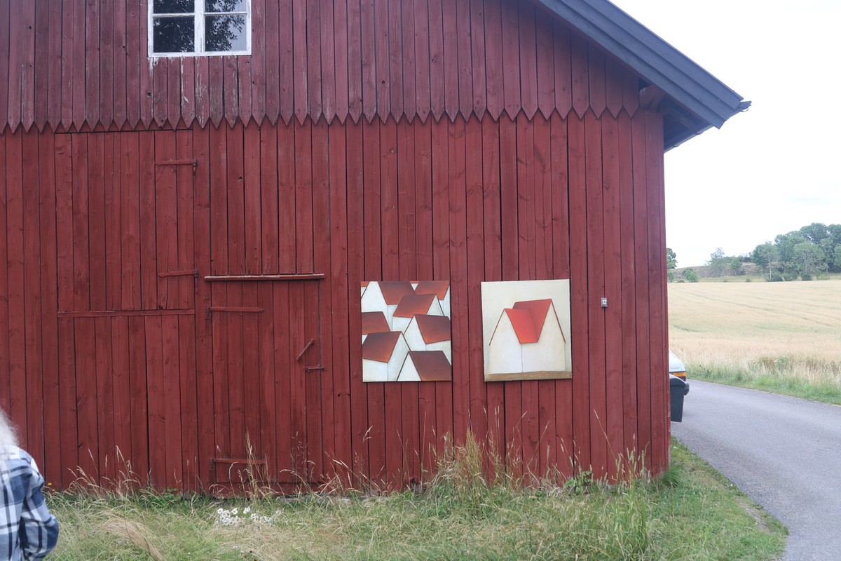 Jag kan inte låta bli att nämna några verk som bet sig fast hos mig. Tommy Wästberg visar ett triangelformat tyg genombrutet av triangelformer. Det är uppspänt mellan ett par träd vid kanten av en damm. Geometrin och naturens vildvuxenheta speglar sig liksom dubbelexponerande tillsammans i den stilla dammens vattenyta.