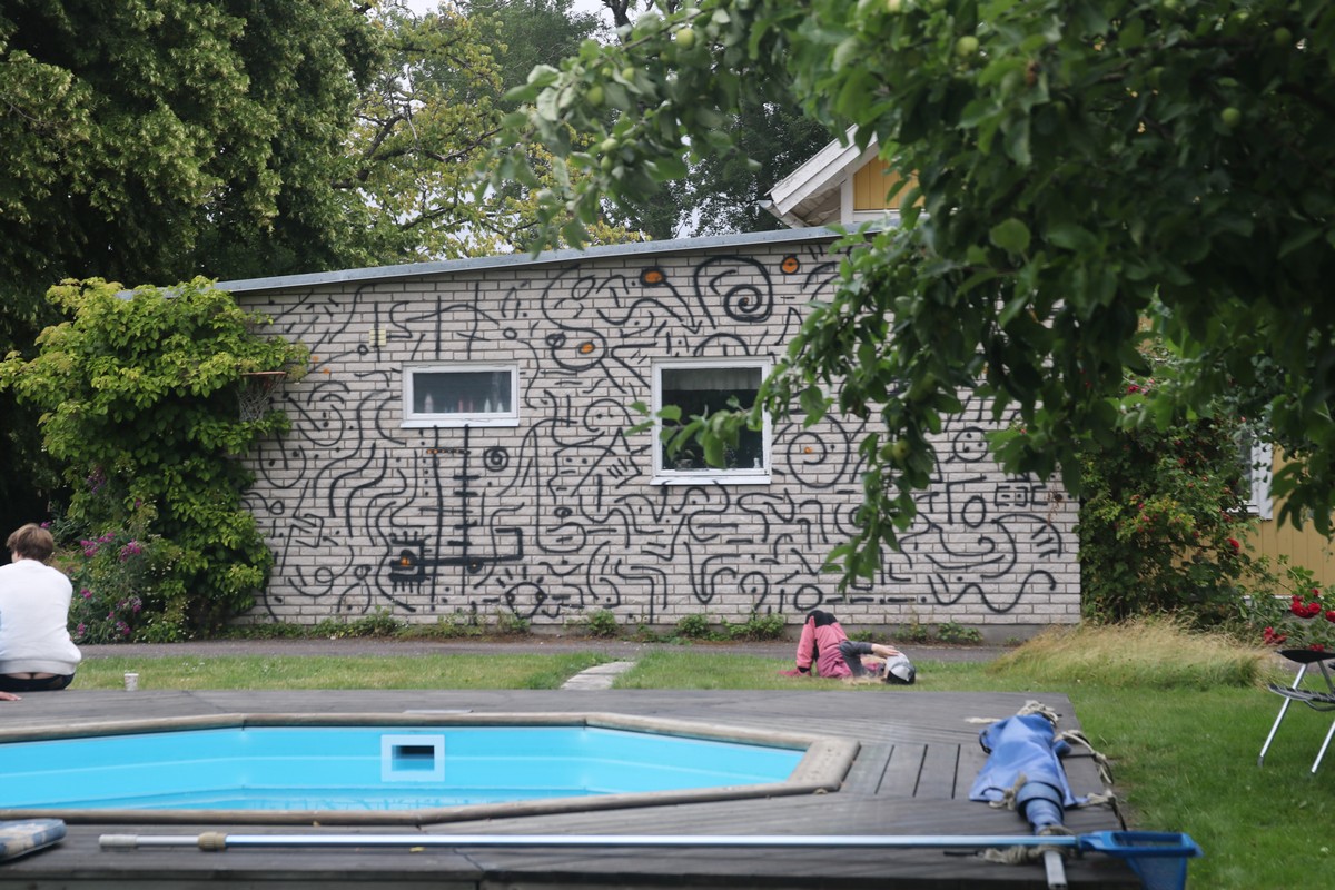 Rum 44 är ett konstreservat kring Anette och Per Sjölanders bostadshus och på deras tomt och marker. Alla delar av deras fastighet får tas i anspråk, Den stora tomten, ekonomibyggnaderna, de andra mindre husen och så vidare. På bostadshuset finns en vägg av mexitegel. Och visst, mexitegel är ju nästan en symbol för vad ”konstfolk” inte ska gilla När Anette och Per låtit konstnären Tony Topp göra ett graffittimönster på väggen är det vidsynt och storsint. Fult är det också, men det är smällar man får ta för konstens okränkbara frihet.