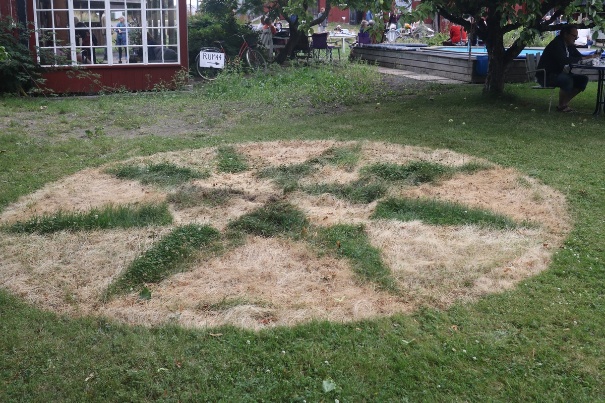 Sigrid Wallskog har gjort en mandorla direkt i gräsmattan. Ännu ett fint exempel på hennes konstnärlighet, kreativitet och oortodoxa stilkänsla.