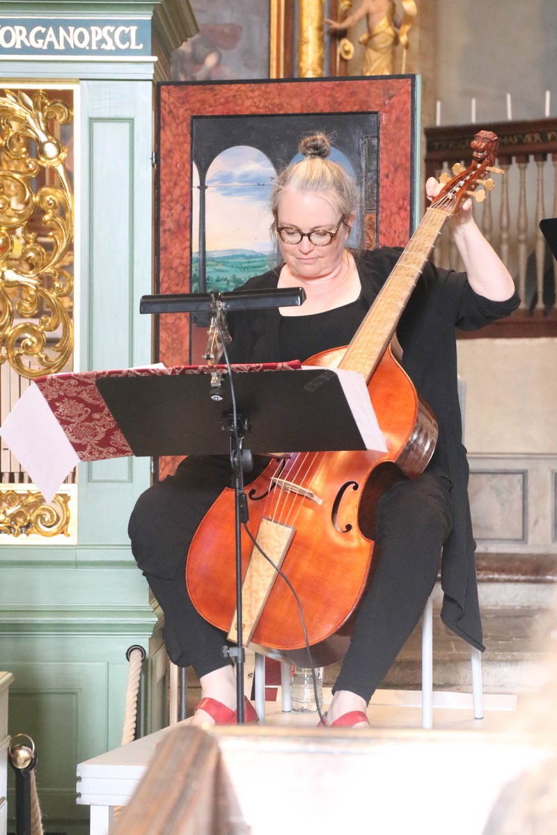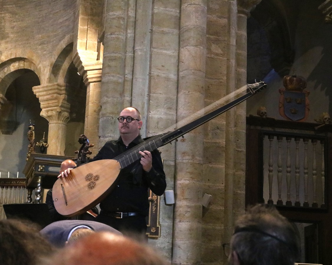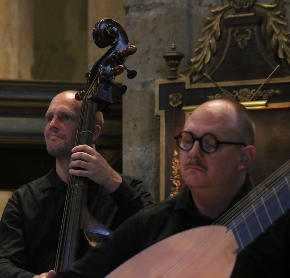Musikerna i Göteborg Baroque är grupperade kring sin ledare Magnus Kjellson. Det är hans ryggtavla vi ser under musicerandet. Han spelar på ett speciellt instrument med det respektingivande namnet claviorganum. Det är en kombination av orgel och cembalo så han kan spela båda samtidigt om så skulle vara. Instrumentet är stilenligt dekorerat på ett för barockkonsten typiskt överlastat sätt med skurna förgyllda ornament och en målning.