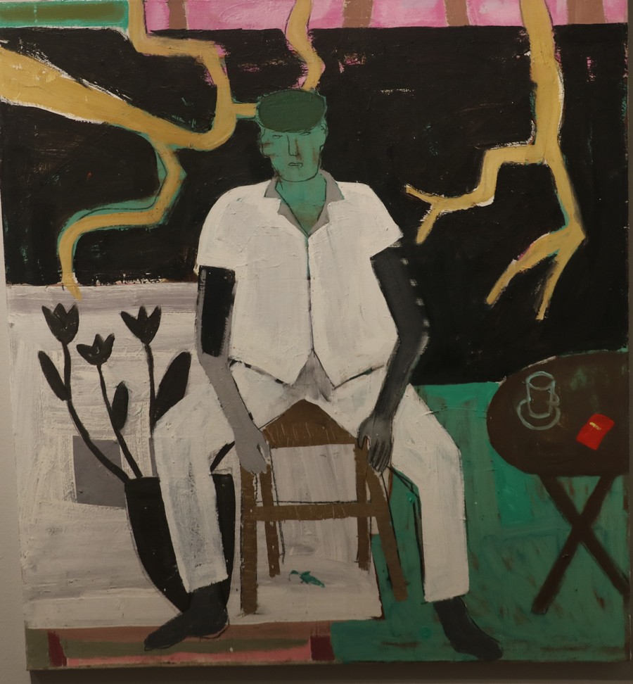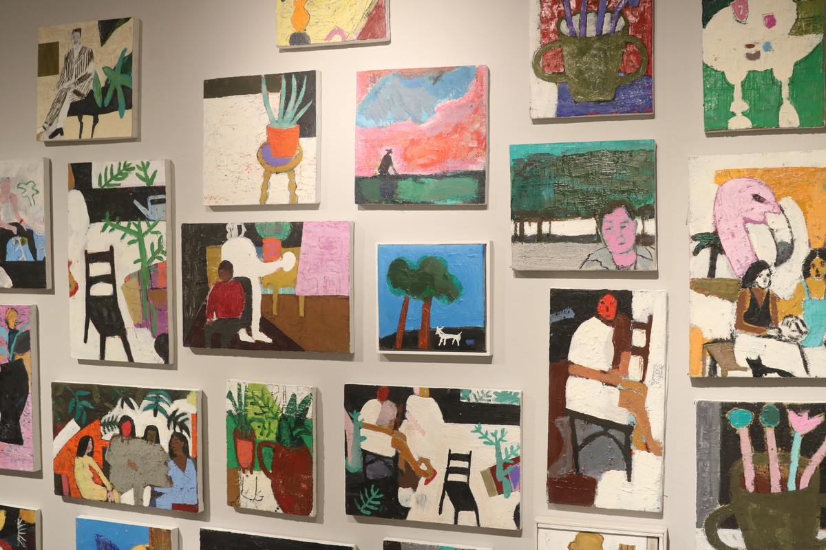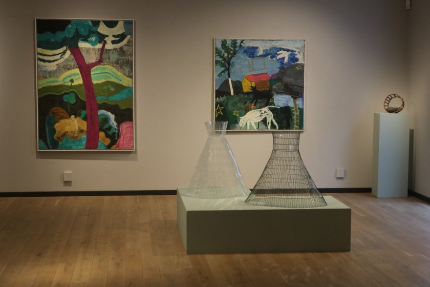 I det mindre rummet finns en vägg med massor av mindre målningar. Där trivs jag bäst. Det blir en uppvisning av hans speciella sätt att måla. Täta färgfält och märkliga kompositioner. Ibland något collageinslag. Färgmötena har sin puls, figurerna en annan. Det är ett vitalt måleri som är lätt att tycka om. Dekorativt och livsbejakande. Och fullt av smittande tillit till måleriet.