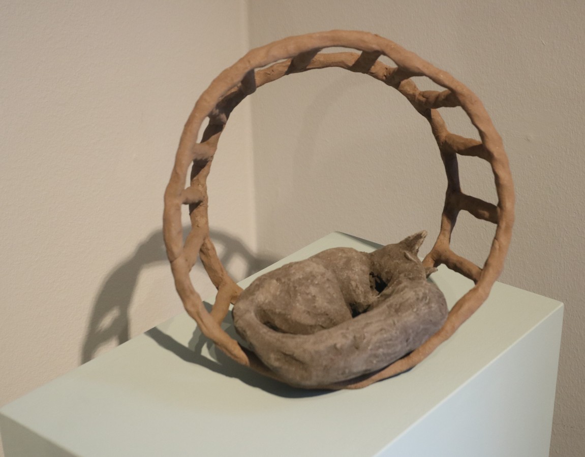 I ett hörn står en drabbande skulptur i oglaserad lera. I ett ekorrhjul ligger två djur i vila och en så fin gemenskap att deras svansar blivit en. De sover i tryggt och lyckligt ovetande om att allt är fåfänglighet och att springet i ekorrhjulet är ett jagande efter vind. En finstämt poetisk bild.