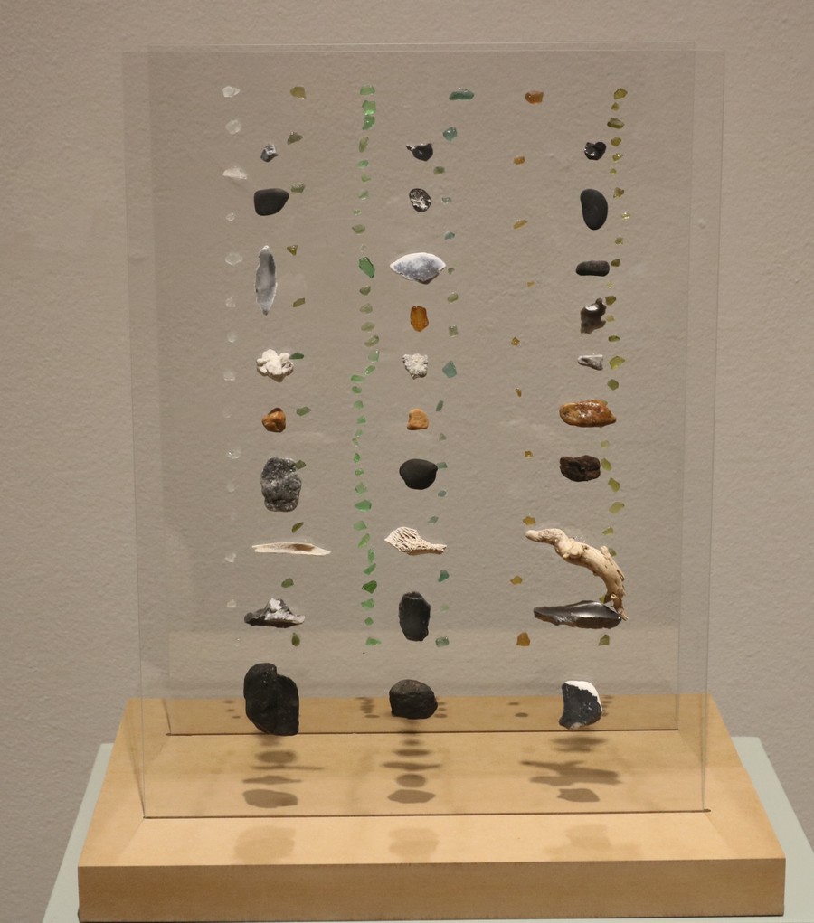 Ett annat fint verk är ett montage av två glasskivor. På den främre är funna föremål monterade i rader. Det tycks valda och monterade med stor bildkänsla. En fin och respektfull bild av livets oförlikneliga mångfald.