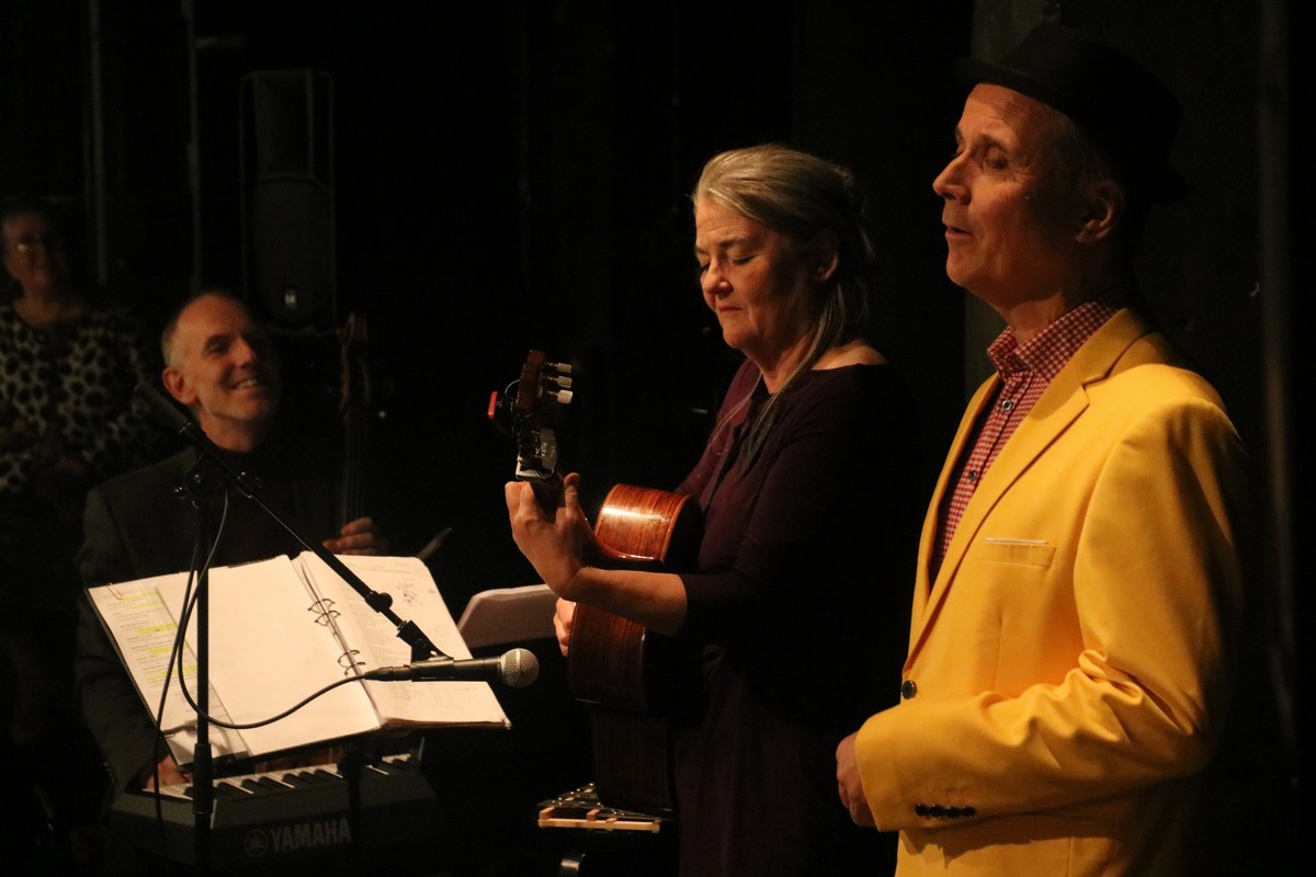 Fia Adler Sandblad sjöng många av sångerna. Jag var glad att hon undvek det där piafska superutspelet (det klarar väl egentligen bara Piaf själv), utan har hittat ett annat sätt. Just hennes sätt att gestalta trovärdigt och hitta sin egen väg in i sångerna och deras ofta storstilade dramatik fungerade bra. Hon spelade gitarr och klingade på glockenspiel. Hon spelade också melodica, litet stolpigt i mina öron, men det skapade ändå stämning.