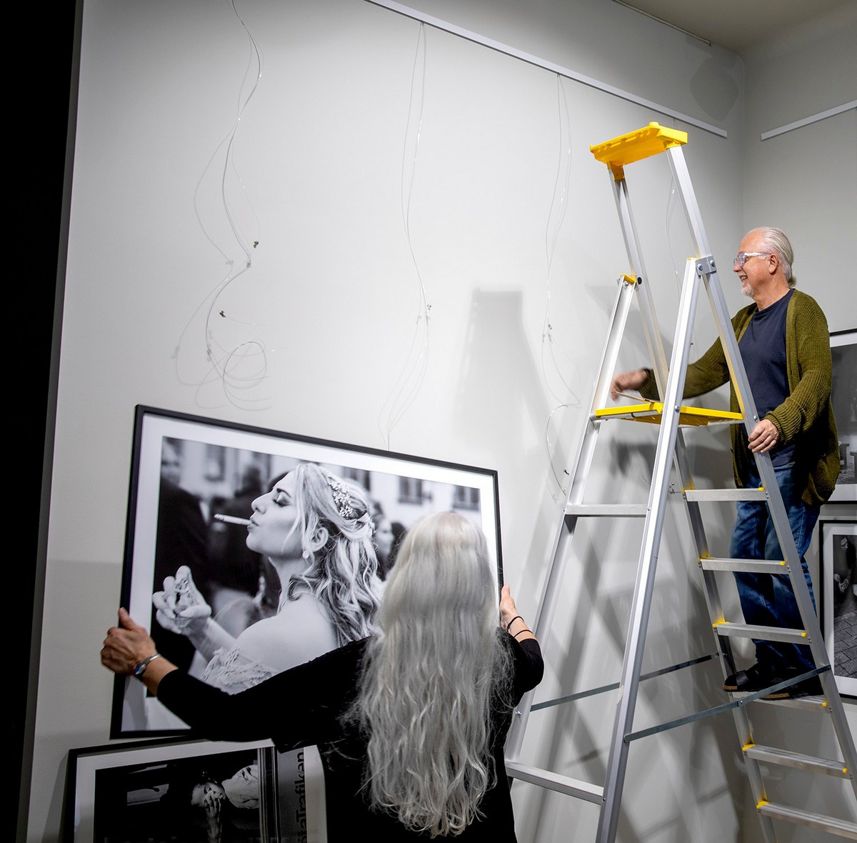 Ateljé Ugglas Mats Burman på stegen hänger fotografier av och med Birgitta Nilsson