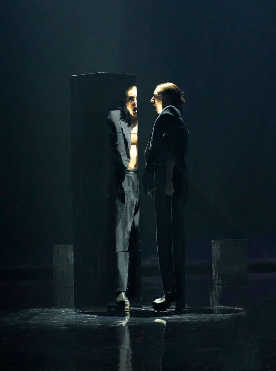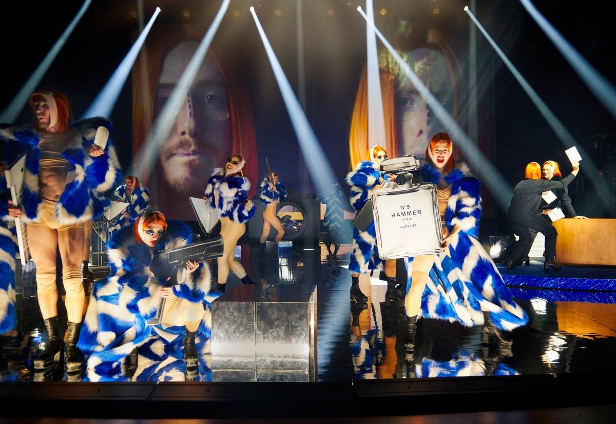 Dramat utspelar sig mot en stark scenografi. En märklig jättebild i fonden där ett huvud sänks ner och slickar golvet. Och märkliga små egotorn byggs och rivs. Och det är hård kamp om uppmärksamheten och om att få stå i centrum och höja sig över de andra.