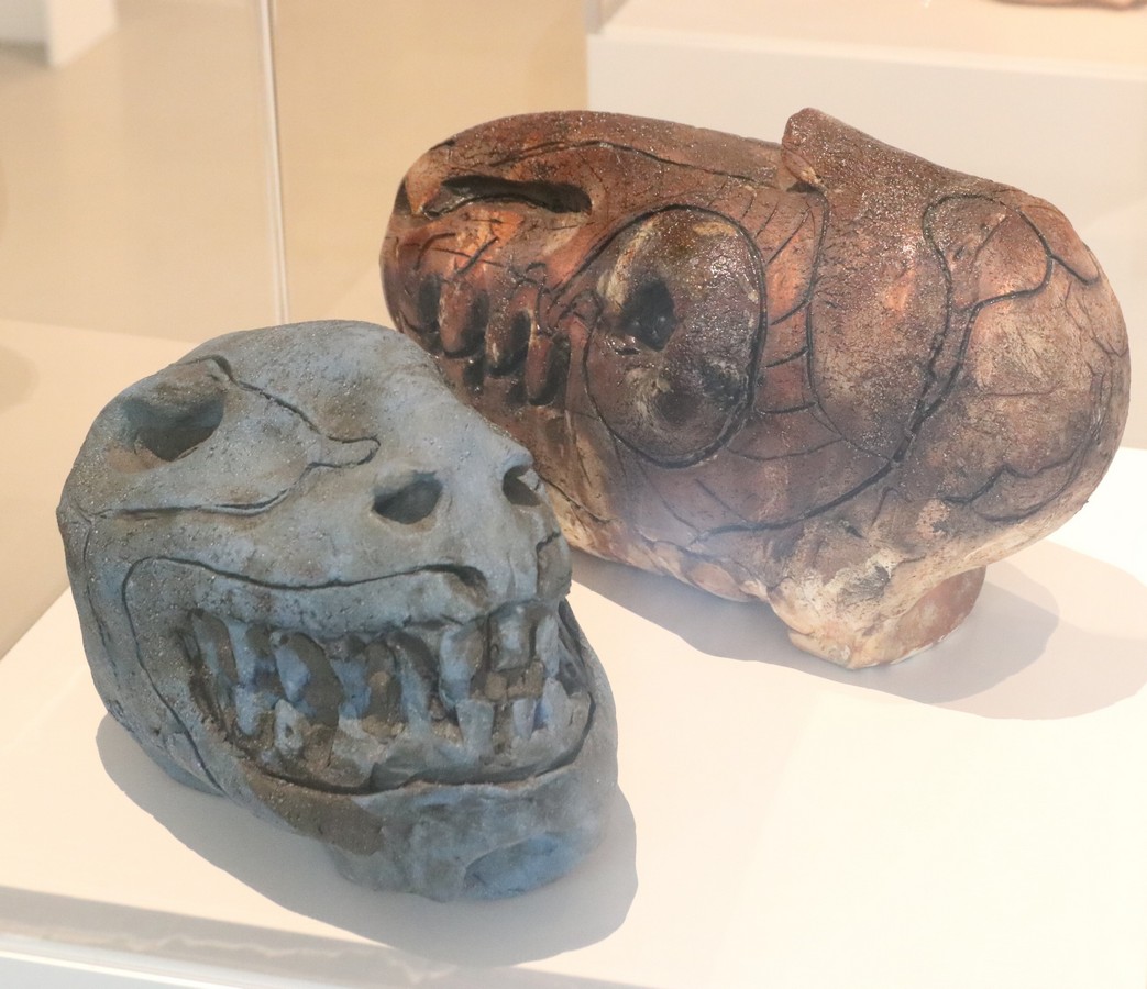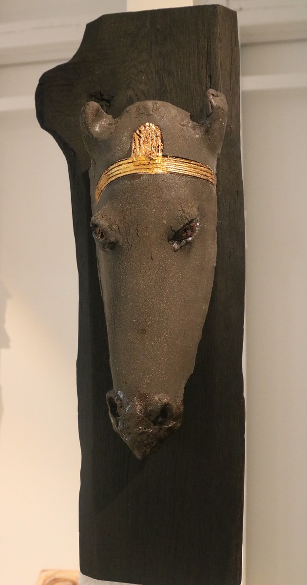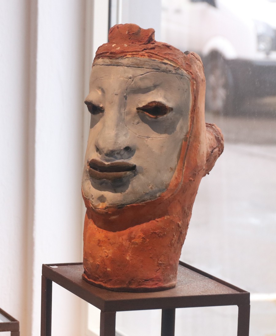 På utställningen kan vi se särskilt goda exempel på de märkliga långsmala masker han gjort genom åren. De har drag av både vardaglighet och myt. Man upplever dem som på en gång djuriska och mänskliga. Djur och människa liksom smälter samman. Ingen överordnade den andra. Alla är vi likvärdiga i vår Herres hage tycks han mena. Hans skulpturer kan se uråldriga ut, som vore de gjorda i ett nästan urtida bildspråk. Men i hans konst ligger det primitiva mycket nära det förfinade uttrycket. Dåtida och nutida smälter samman.