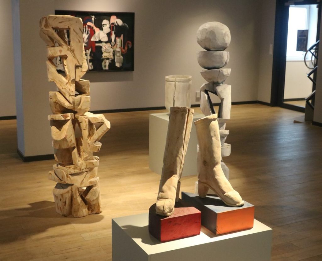 Jonas Liveröd bor och arbetar i Ågårdskvarn utanför Götene. Han är en konstnär som verkar göra allt och finnas med överallt och jämt. Det var inte länge sedan han ställde ut här i Lidköpings konsthall. Nu visar han några träskulpturer. Ett par stövlar till exempel Och några pelare som väl snarast är parodier på modernistisk ”geniskulptur”. De här verken är gjorda i motorsågsgrov apparition. Och det verkar viktigt att sprickorna i träet är tydliga. Kanske är de betydelsebärande. Han visar också ”collageteckningar”. De ser kul och speciella ut.