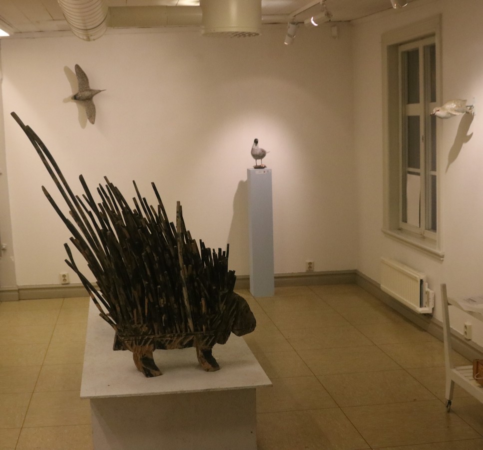 Martin Hansson är nu aktuell med en utställning på Bladhska galleriet i Skara. Den domineras av djur, mest fåglar. Och han kan sina fåglar och andra djur. Man märker att han intresserar sig för hur de anpassat sig i form och beteende till den miljö där de lever. Här finns t ex en grupp verk som visar hur olika skyddsstrategierna i utseendet kan vara hos olika djur, från piggsvinets taggar till klotbälta.