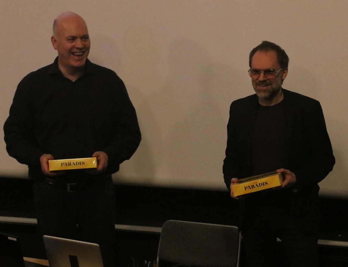 Här fick vi se filmen med liveljud i form av såväl DJ-musik och slagverk på plats. DJ var tonsättaren och ljudkonstnären Lars Carlsson. Han spelade från sina datorer en välvald musikblandning av högsta kvalitet och oktan. En flod av musikklipp dök upp. Vad sägs om Philip Glass, Mike Oldfield, Igor Stravinskij, Dimitri Shostakovich, Stockhausen för att bara nämna några. Lars Carlsson hade också lagt in en snutt egenkomponerad musik. På andra sidan den stora duken satt slagverkaren Marcus Hedenfalk. Han slog på allt från koskällor, till tubular Bells, klockor, burkar och ett vanligt trumset. Lars Carlsson är ursprungligen en mariestadare, nu är verksam i Göteborg. Marcus Hedenfalk är lärare på musikskolan i Lidköping.