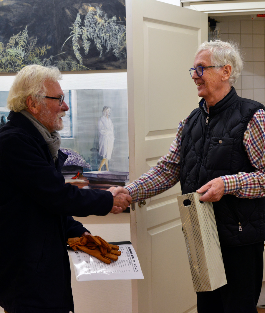 Yvonne Larsson samtalar med konstnärskollegan Bengt Rindner — Seglare (på väg ut från galleriet?)