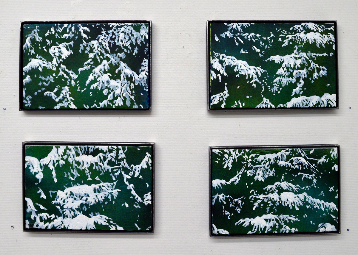 Gammelskog II, t.v. — Vinterskog, tung snö & Vinterskog I – IV, t.h.