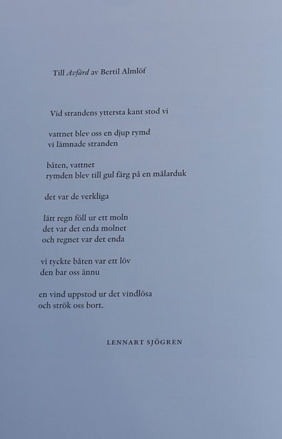 Men många av bilderna vänder blicken mot det opolitiskt existentiella. Inte sällan kan det handla om den död och förgängelse som ingår i själva livsvillkoren. I boken finns en fin dikt, en ekfras, av poeten och konstnärskollegan Lennart Sjögren som visar hur fint Bertil Almlöfs bilder trivs i skriven poesis sällskap.