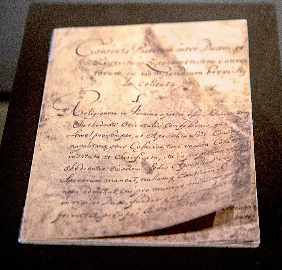 Författningen är en skör liten skrift på latin, förmodligen en översättning av originalet på ukrainska, som stadgar bland annat hur gränserna ska dras, vilken religion som är tillåten (den grekisk-ortodoxa) och hur styrelseskicket ska vara (maktdelning) för Ukraina vid den tiden, alltså för över trehundra år sedan.